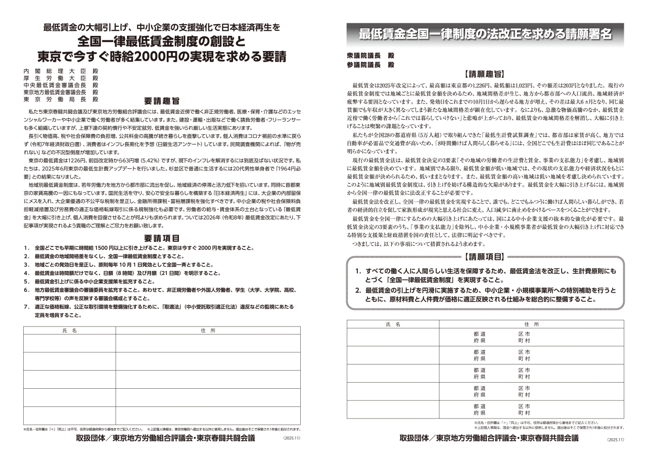 2026 最低賃金 めざせ2,000円 署名用紙