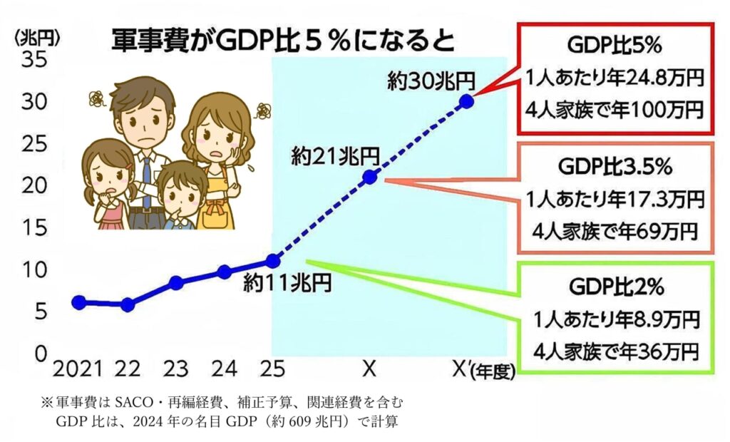 政府は1976年、軍事費を「国内総生産(GDP)比1%」以内に抑える原則を確立し、これを長く維持してきました。ところが「すべての同盟国は軍事費をGDP比2%以上に上げるべきだ」という米政府の要求に応えるため、2022年の安保3文書で、23~27年度の5年間で、防衛省以外の予算も含めて一気に2倍化=GDP比2%(約11兆円)に拡大すると決定。さらに米国防総省は昨年、日本に「GDP比3・5%以上」を打診したと報じられています。