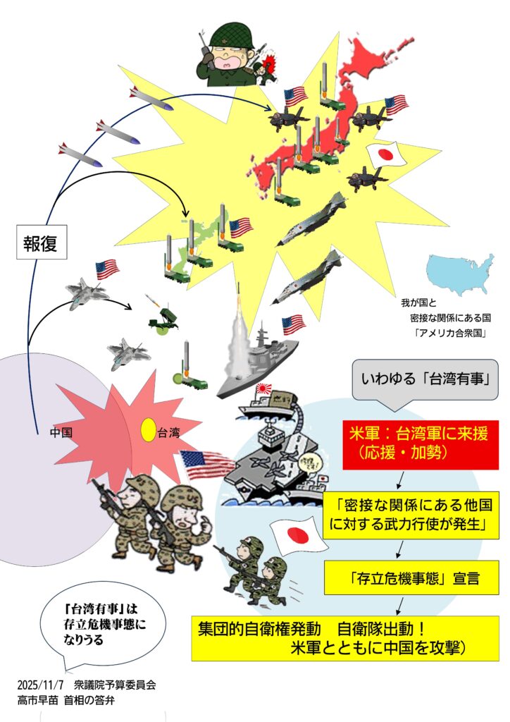 台湾防衛としてアメリカ軍が台湾軍応援?として参戦。ある国は当然として反撃。アメリカ軍への攻撃は、”我が国と密接な関係にある国” への攻撃であり、集団的自衛権により日本の自衛隊が参戦。(なんてったて、日本にある米軍基地から攻撃するので、報復があれば、「我が国の存立が脅かされ、国民の生命、自由及び幸福追求の権利が根底から覆される明白な危険」となります)